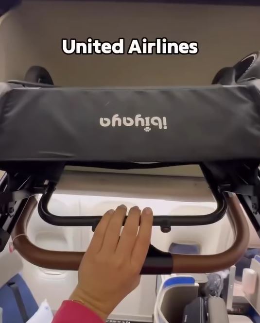 The tri-fold stroller frame collapses compactly for storage in overhead bins or car trunks.